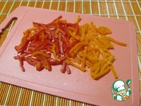Сладкий перец нарезать соломкой. Я взяла половинку красного и половинку оранжевого перца. |