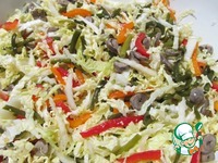 Пекинскую капусту нарезать соломкой и смешать со всеми подготовленными продуктами. |