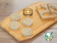 2. Вырезаем из кусочков хлеба 8 кружков, Ф=5 см. Подсушиваем их в духовке или росторе. |
