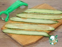 3. Нарезаем тонко огурец длинными пластинами и кладем на бумажное полотенце. Промокаем с двух сторон. |