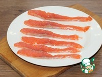 4. Рыбу желательно нарезать тонкими по толщине и длинными кусочками. Чтобы закуска была красивой, лучше купить уже нарезанную пластинами рыбу. |