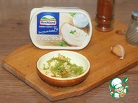 5. Плавленный сыр смешиваем с прессованным зубчиком чеснока и измельченным укропом. Добавляем смесь перцев и перемешиваем. |