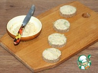 6. Смазываем кружочки хлеба сырной намазкой. |