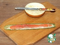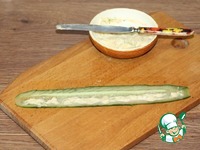 8. Смазываем сырной смесью пластину огурца. |