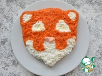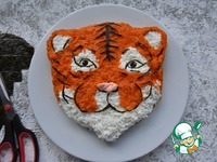На блюдо выкладываю слоями салат в форме головы тигренка. Можно определить границы, нарисовав майонезом контур головы. Каждый слой промазываю небольшим количеством майонеза.