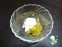 Для второго соуса смешать майонез, сметану, мелконатертые маринованный огурец и зубчик чеснока. |