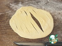 Каждую часть теста раскатать в пласт толщиной 1-2 мм. Пласт теста, отступая от краев 5 мм, нарезаем полосками шириной около 5-6 мм. |