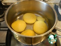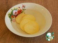 Почистим, нарежем кружочками, зальем горячей водой на 5 минут, чтобы горечь ушла. |