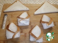 Две стороны соединить к середине треугольника и придавить руками, чтобы хлеб сплющился. Скрепить зубачисткой. |