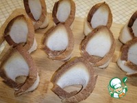 Противень застелить пергаментной бумагой. Расставить стоя наши заготовки тарталеток из хлеба. |