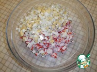 Яйца нарезать мелкими кубиками и отправить в миску к крабовым палочкам. |