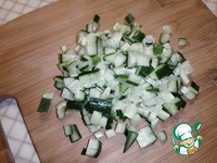 Огурец также нарезать небольшими кубиками, высыпать в миску. |