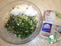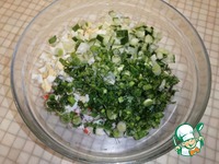 Зелёный лук и укроп мелко нарезаем и отправляем к остальным ингредиентам. |