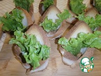 Листья салата разделить на небольшие кусочки. В каждую тарталетку вложить кусочек листа салата. |