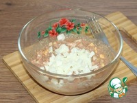 3. Яйца отварить до полной готовности, остудить, почистить и разделить на желтки и белки. Белки порезать кубиками, желтки размять вилкой. Белки и 1 желток выложить в миску. |
