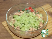 5. Петрушку и укроп мелко порезать. Огурец порезать кубиками. Огурец и зелень кладем в миску, добавляем по вкусу молотый перец, соль и лимонный сок, перемешиваем. |