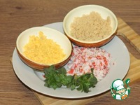 7. Для украшения салата: зелень, крабовое мясо, измельченные орехи и желток. Так как печень в масле, то его достаточно в салате. |