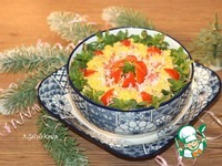 8. Выкладываем салат в сервировочное блюдо и посыпаем измельченными орехами (1/2 часть). Украшаем салат зеленью, желтком, крабовым мясом и помидорчиком черри. Приятного аппетита! |
