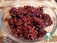 Для второй начинки сушеную клюкву порубить в блендере вместе с орехами. В рецепте грецкие орехи. Но я готовита и с фундуком. И так, и так вкусно. Думаю, тут можно экспериментировать. |
