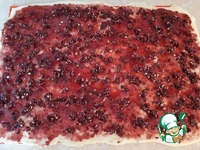 Достать тесто из холодильника, разделить его на 2 части. Каждую часть раскатать в прямоугольник и смазать начинкой из свежей клюквы. Затем равномерно разложить начинку из сушеной клюквы и орехов. |