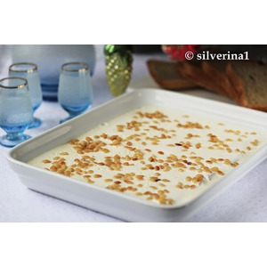 Залить язык сливками и через несколько минут посыпать его орешками. |