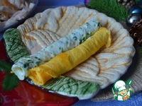 Переложить на блюдо для подачи, яичные рулетики нарезать и украсить салат сверху. |
