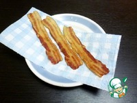 Сначала нужно поджарить три слайса бекона до хруста. Положить на бумажное полотенце, чтобы впитать жир и бекон остался хрустящим. |