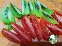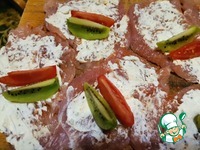 Творожный сыр нанести на мясо ровным слоем. Сверху выложить по одной дольке киви и помидора. |