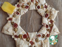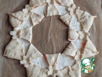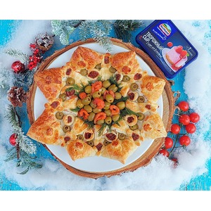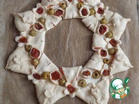 Описание: Пирог с лососем и творожным сыром - легкая и вкусная закуска для небольших посиделок. Основа пирога слоёное тесто, а украшение вяленые томаты и оливки. Пирог приготовлен в виде новогоднего венка, создавая зимнюю и праздничную атмосферу.