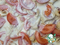 Поверх выкладываем нарезанные дольками или кольцами помидоры. |