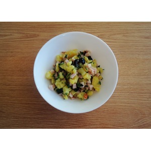 Сегодня приготовим болгарский салат. Он близок по духу к нашим салатам, в частности к русской версии оливье, так как содержит картошку и ветчину. В целом порцией такого салата можно пообедать. Готовится он просто и быстро, не считая того что надо сварить картошку. Итак, нам понадобятся: