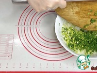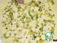 Смазываем растопленным сливочным маслом, сверху кладём начинку и равномерно распределяем по всей поверхности. |