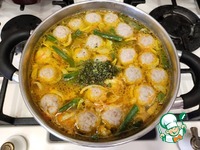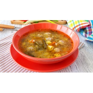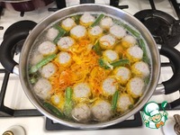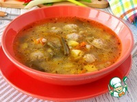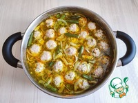 В кастрюлю с перловой крупой добавить фрикадельки, картофель, следом добавить стручковую фасоль (2 горст.), добавить по вкусу соль и черный молотый перец, добавить лавровый лист (2 шт.). |