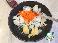 Репчатый лук (1 шт.) нарезать полукольцами, морковь (1 шт.) нашинковать соломкой. |