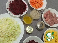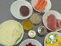 Свеклу и морковь — пускаем через терку. Лук и капусту мелко шинкуем. Картофель и свинину — средними кусочками. |