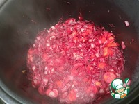 Отправляем в чашу масло, лук, морковь и свеклу — Режим «Жарка» 12 минут (Не забываем перемешивать каждые 2-3 минуты). |