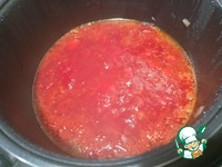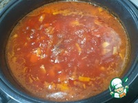 Добавляем в чашу томатную пасту, свинину и 1 литр воды — Режим «Тушение» 40 минут. |