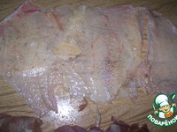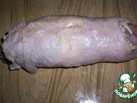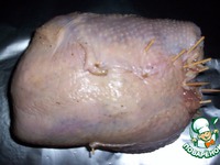 Закрутить в большой рулет - закрепить куриную кожу зубочистками |