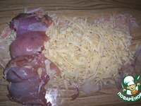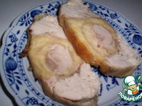 - на вторую кожу положить куриные грудки, положить рулет с сыром, |