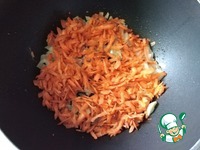 Далее выкладываем натёртую морковь. Убавляем огонь на минимум, накрываем крышкой и томим морковь с луком минут 5. |
