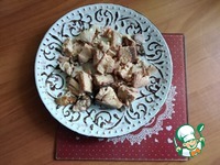 Тем временем, вынимаем кусочки горбуши на тарелку, убираем кости и измельчаем её, не совсем уж мелко. |