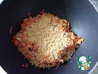Выкладываем булгур. Перемешиваем и с минуту даём булгуру пропитаться овощно-чесночным ароматом. |