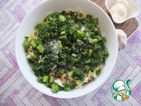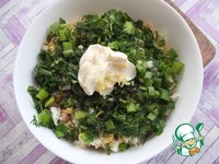 Мелко шинкуем зелень и добавляем в салат. Солим и перчим по вкусу. |