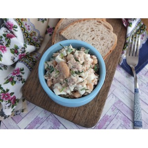 Фасоли я взяла стандартную банку, общий вес 400 г. Жидкость слила. Тунца у меня было две маленькие баночки по 100 г. в собственном соку, сок оставила его было немного. |