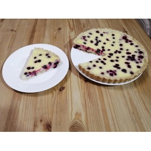 Песочная основа с нежной сметанной заливкой. В меру сладкий с легкой кислинкой, которую придает черная смородина.