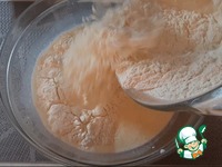 Готовим опару на ночь. К пшеничной закваске добавляем муку и воду комнатной температуры. Хорошо перемешиваем. |