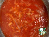 Лук тоже обжарить и добавить томатную пасту, щепотку сахара, соль и перец. |
