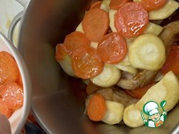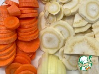 Морковь и белый корень почистить, вымыть и нарезать кольцами или полукольцами. Лук нарезать полукольцами. Морковь и пастернак обжарить на подсолнечном масле, посолить и поперчить. |