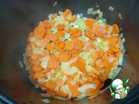 Отправляем в чашу масло, лук и морковь — Режим «Жарка» 10 минут (Не забываем перемешивать каждые 2-3 минуты). Если хотите чтобы овощи более «жаренные» готовьте с открытой крышкой. |