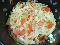 Добавляем в чашу капусту — Режим «Жарка» 8 минут. (Не забываем перемешивать каждые 2-3 минуты). Этот пункт наоборот желательно делать с закрытой крышкой. |